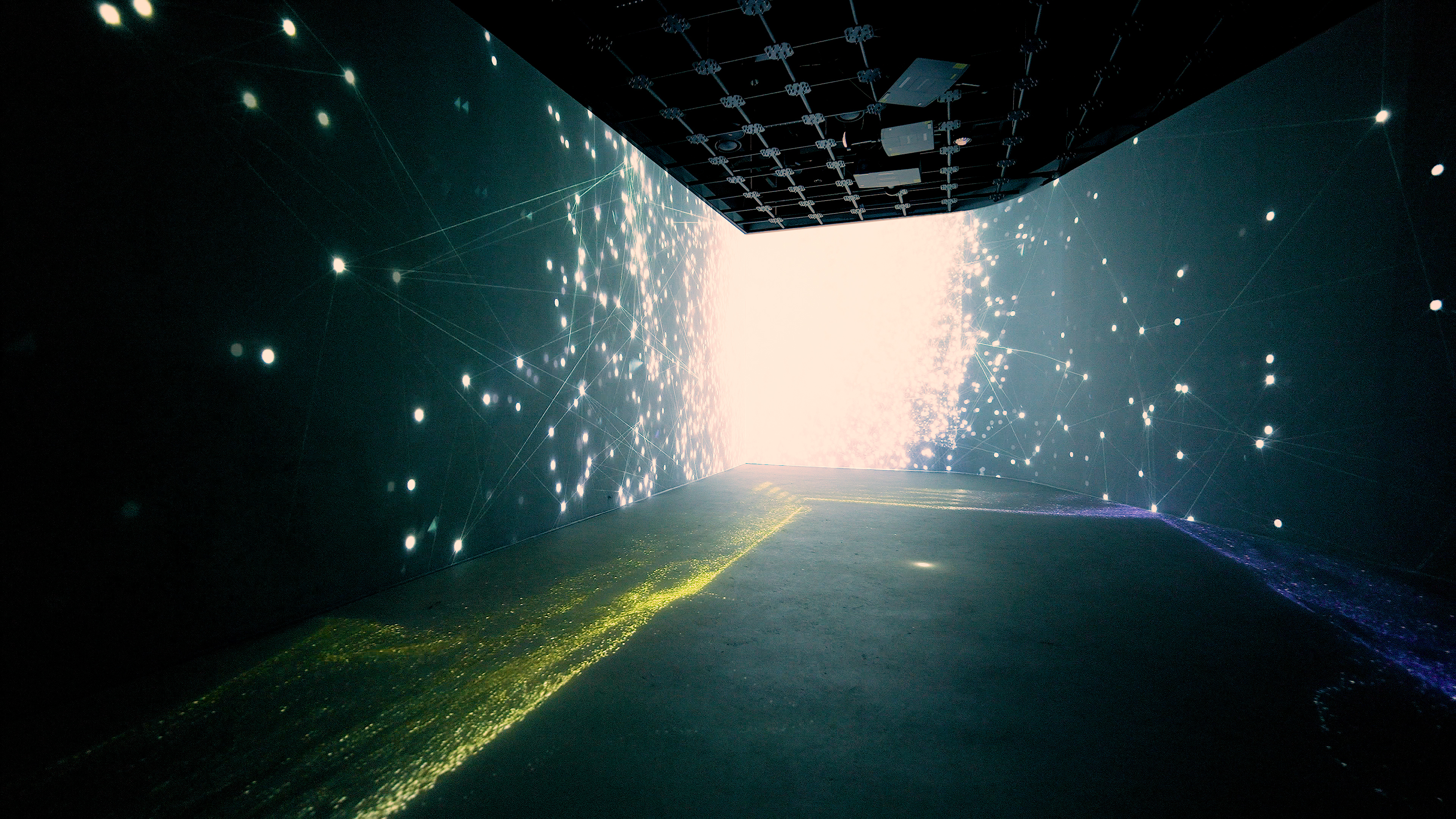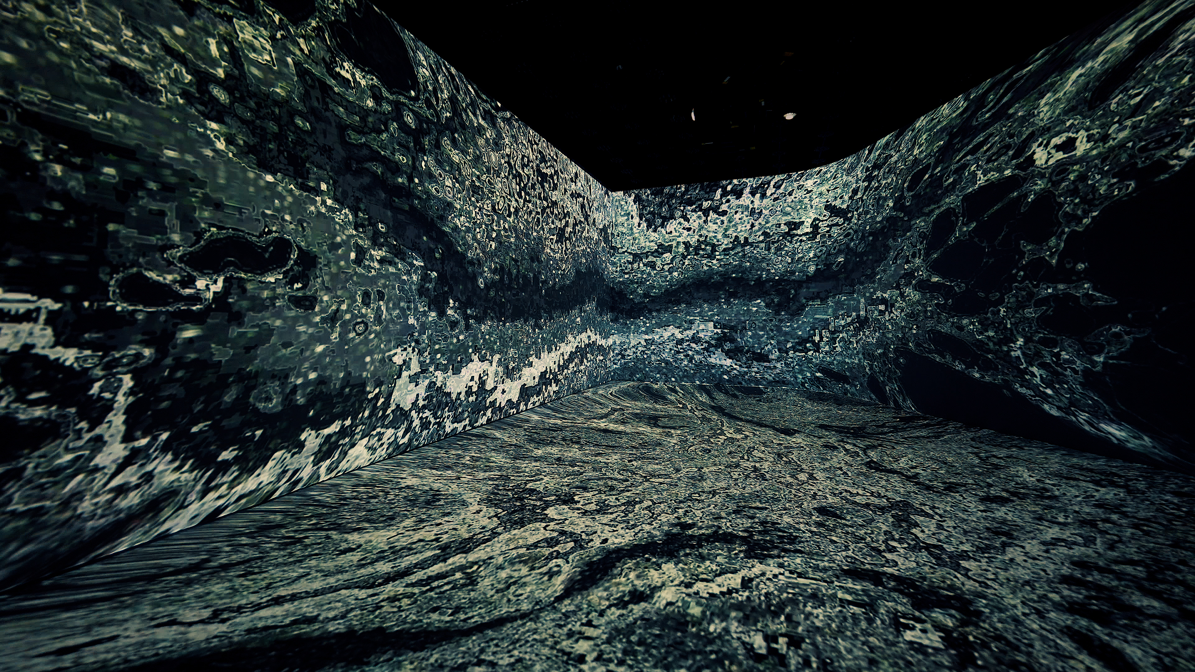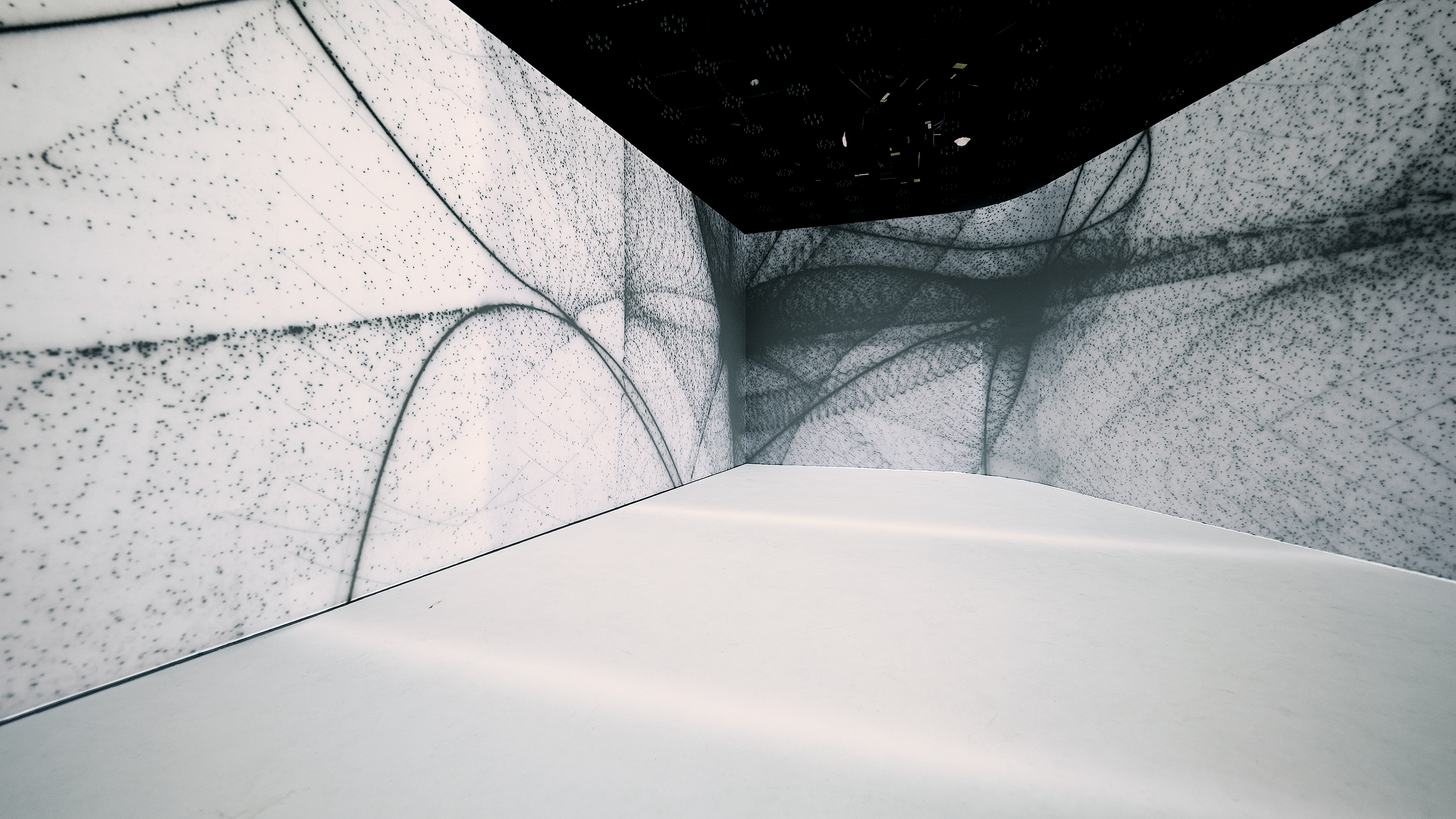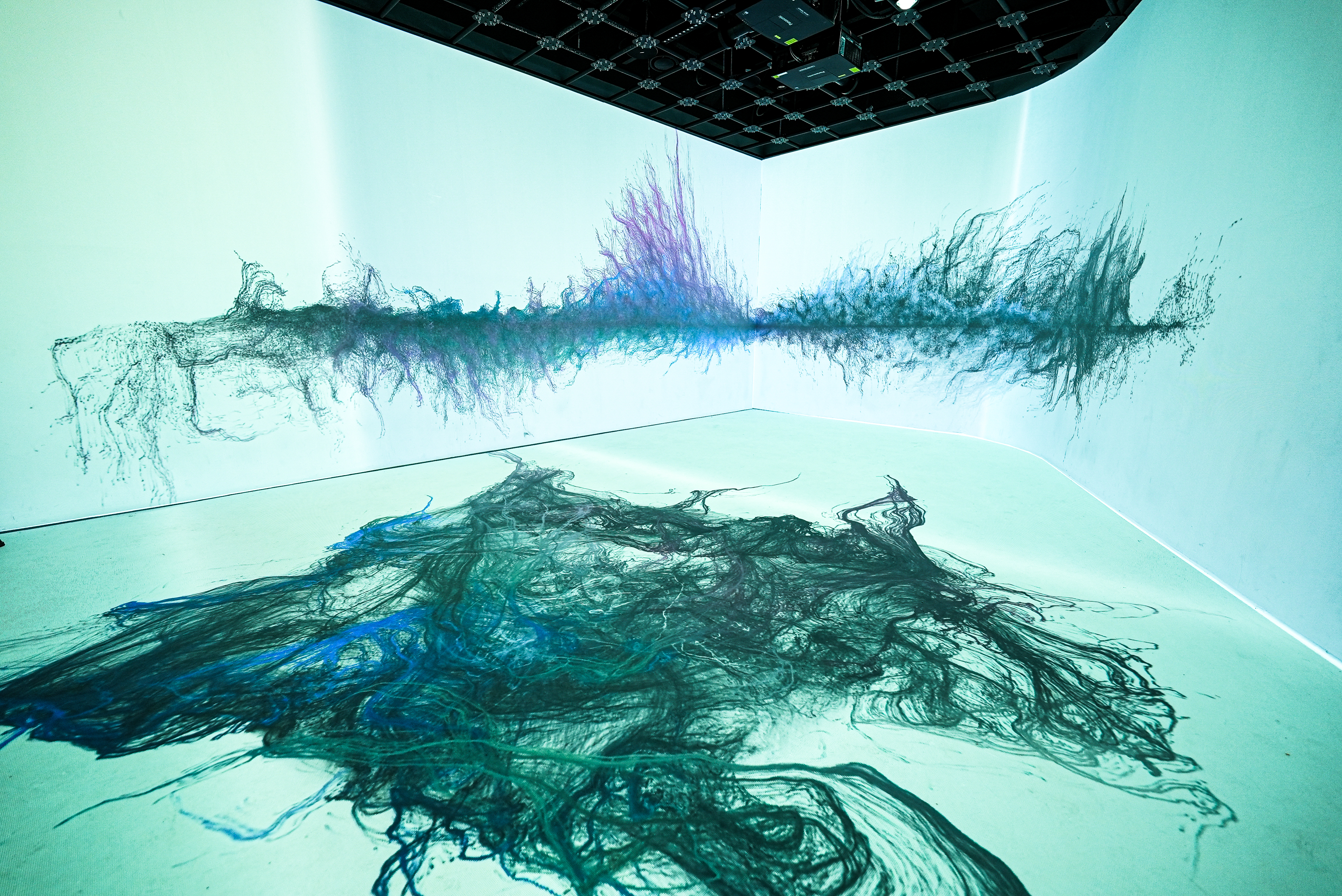 공허(VOID)를 채우는 소리의 입자들을 탐구합니다. 암흑 속에서 오디오에 반응하며 흩어지고 모이는 유체의 흐름은, 무(無)의 공간에 투영된 소리의 잔상이자 역동적인