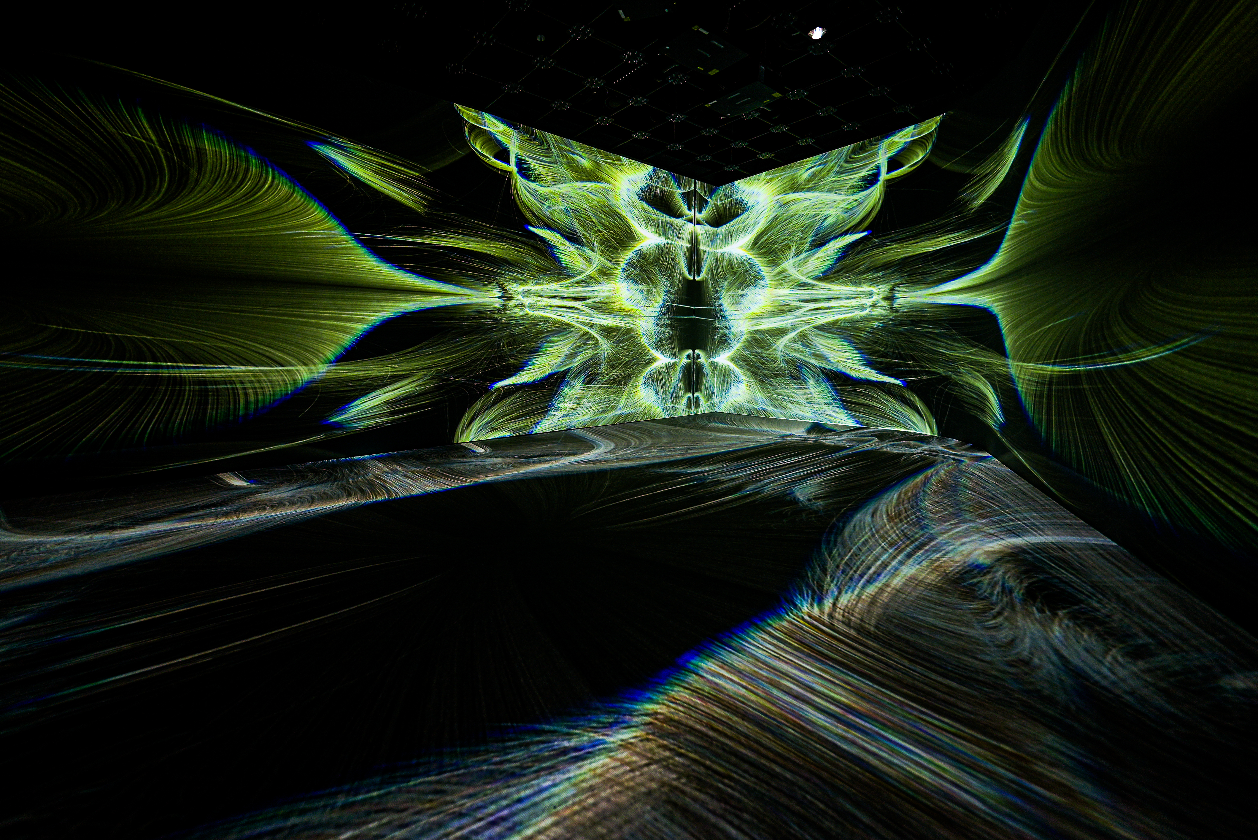 고정된 좌표계 위에서 음악적 리듬을 연산하여 걷잡을 수 없이 증식하는 디지털 유기체를 선보입니다. 대칭의 축을 중심으로 흐르는 유동적 빛(Flux)은 결코 꺼지지